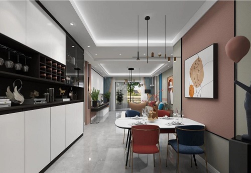 生活是一日三餐與四季,也是家人在一起的歡聲笑語。開放式餐廳搭配低飽和度的粉色墻面背景,將文學(xué)中的至真情愫印刻得生動具體。