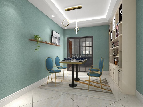 餐廳或許更能代表一個家的溫度,天然居艾草健康植物漆溫暖的湖藍色色系,總是會讓空間變得柔軟舒適。藍色的環境也使人感到幽雅寧靜,是一種令人產生遐想的色彩。