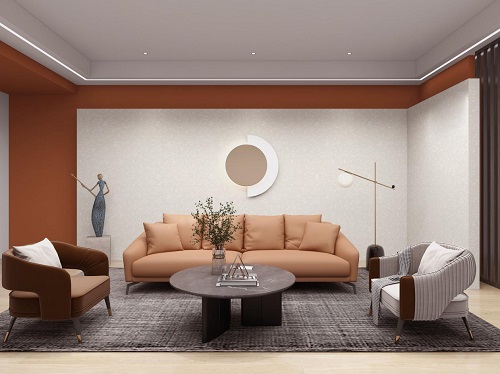 磚紅色和米色的背景墻,造型特別的寫意畫,為客廳的空間奠定了穩重大氣又不失品味的基調。