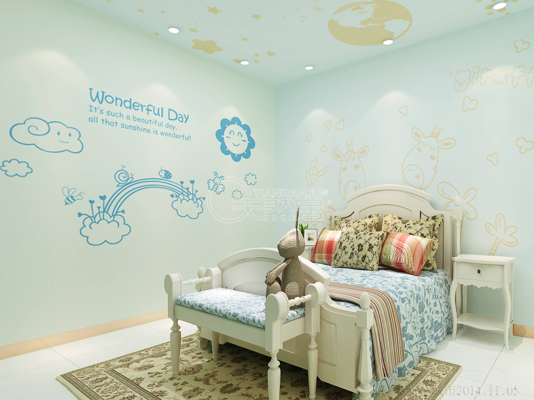 天然居硅藻泥兒童房的活潑可愛風格與立體生動圖案會讓孩子每天擁有好心情,同時給孩子一個充滿想象的空間,提升孩子的審美能力。