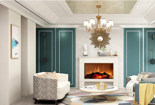 高貴的孔雀藍背景墻鑲嵌白色的金屬線條和白色的大理石相間,散發出精致而優雅的格調。搭配淺色的窗簾,仿佛一打開窗,浪漫春風攜帶點點花香便拂面而來。