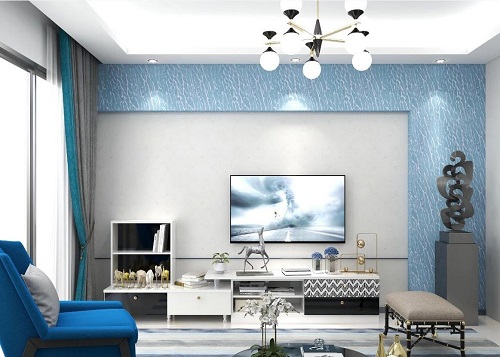 巖紋質感的背景墻和湖藍色的點綴呈現出波光粼粼的山水景象。無論是客廳還是臥室,春之柔軟,躍然而現。