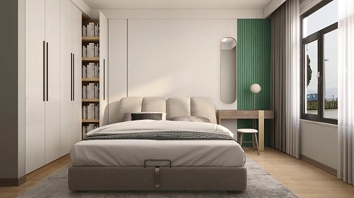 到頂的衣柜設計,內側設計成隱藏書柜,滿足業主睡前閱讀的需求,窗邊的梳妝臺,偶爾可以充當書桌,來滿足隨身辦公的需求。